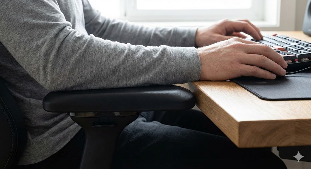 - 內八字測試: 現代人打字時,雙手通常是向內靠攏的(內八字)。 檢查扶手是否能 「向內旋轉」 或 「左右平移」?如果扶手只能固定在兩側,你的手肘會因為懸空而必須長時間出力,這是網球肘的主因。